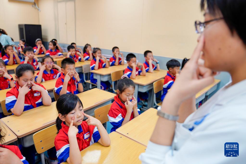 6月5日,在河北省秦皇島市山海關(guān)區南園小學(xué),秦皇島市工人醫院五官科醫務(wù)人員帶領(lǐng)學(xué)生們做眼保健操。