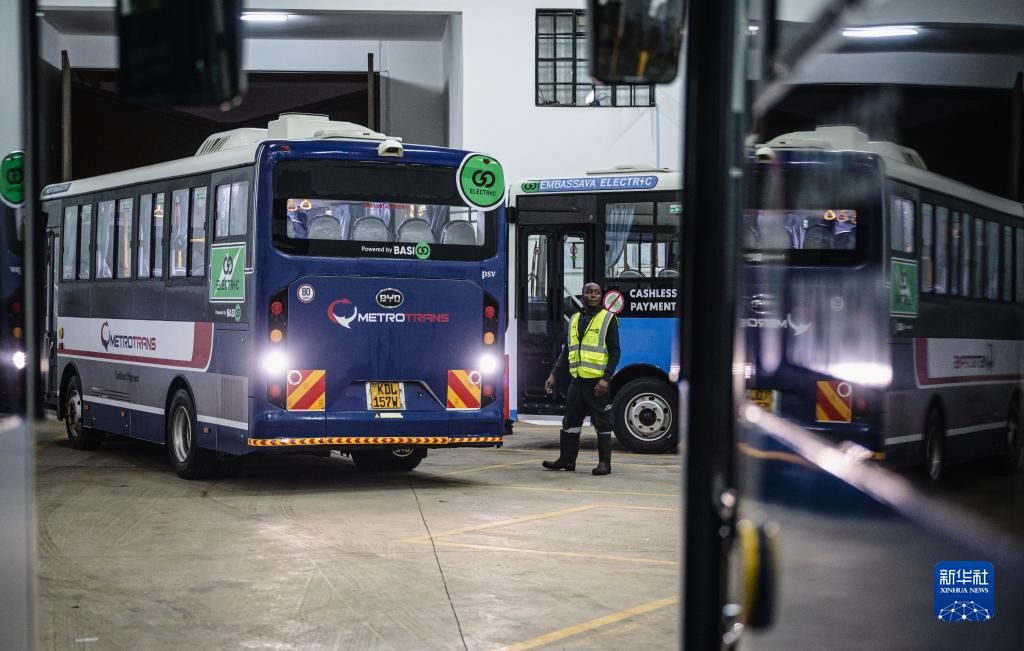 6月2日,在肯尼亞內羅畢,肯尼亞電動(dòng)巴士公司工作人員指揮電動(dòng)巴士進(jìn)站充電。
