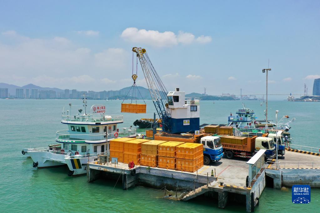 在廈門(mén)海上環(huán)衛站西堤環(huán)衛碼頭,吊機將海上環(huán)衛船上的海漂垃圾箱調運至運輸車(chē)輛上(6月4日攝,無(wú)人機照片)。