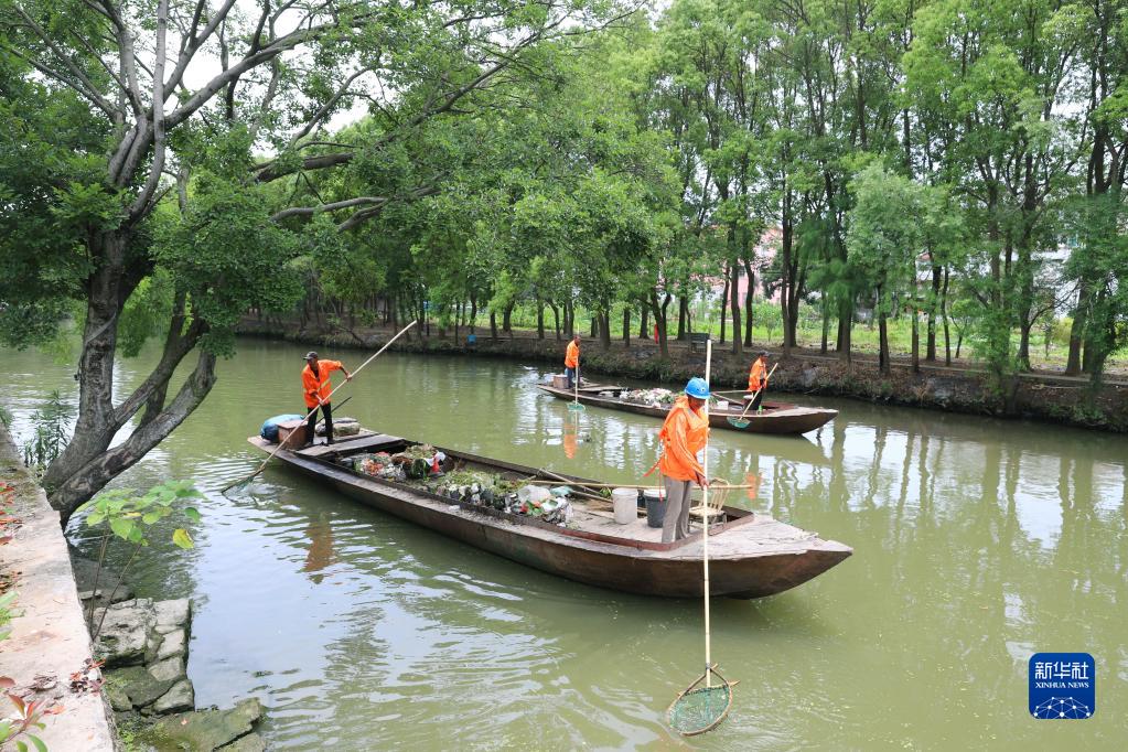 6月5日,浙江省臺州市路橋區蓬街鎮的保潔員在清理河道。