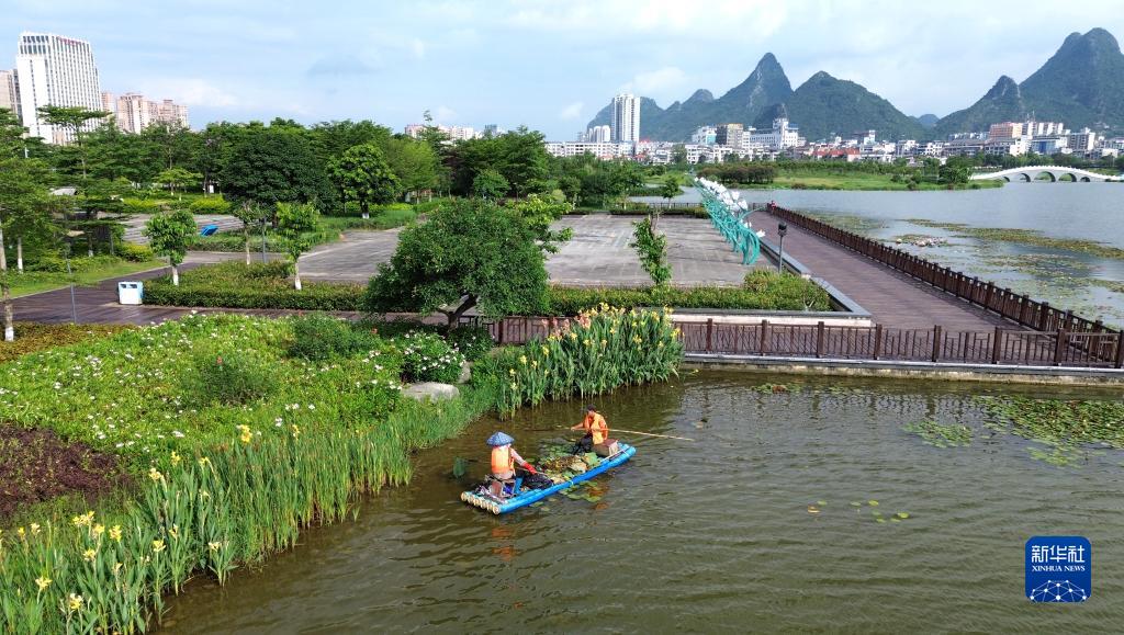 6月5日,廣西賀州市愛(ài)蓮湖公園環(huán)衛工人劃著(zhù)竹筏打撈清理湖面漂浮物(無(wú)人機照片)。
