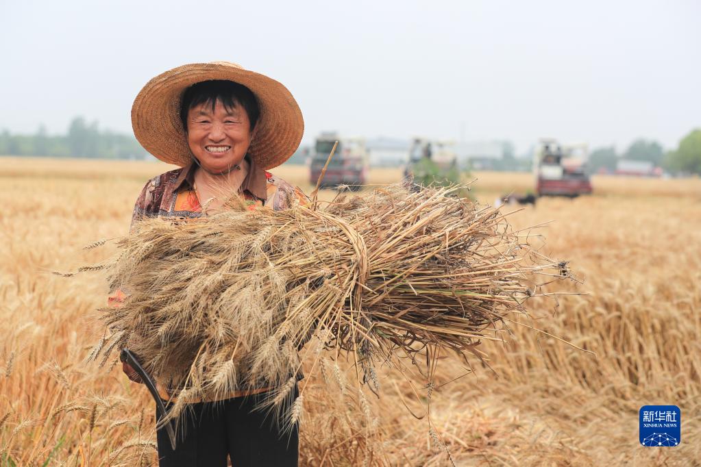 5月30日,在江蘇省揚州市槐泗鎮許巷村麥田里,農民展示剛剛收割的小麥。