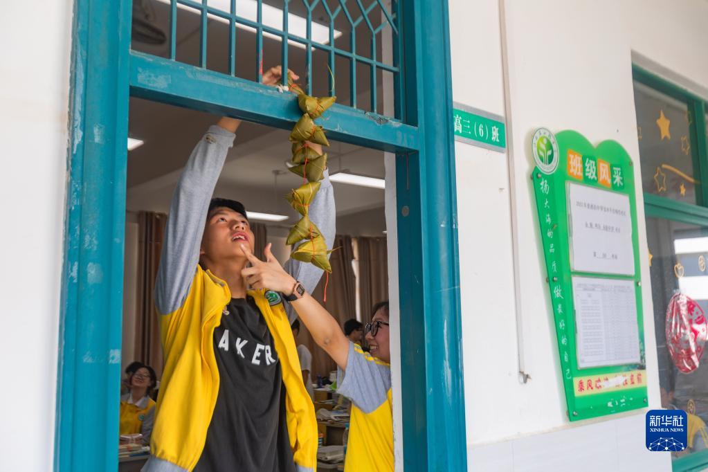 6月5日,江西省永新縣永新中學(xué)學(xué)生掛起粽子,寓意在高考中“高中”。