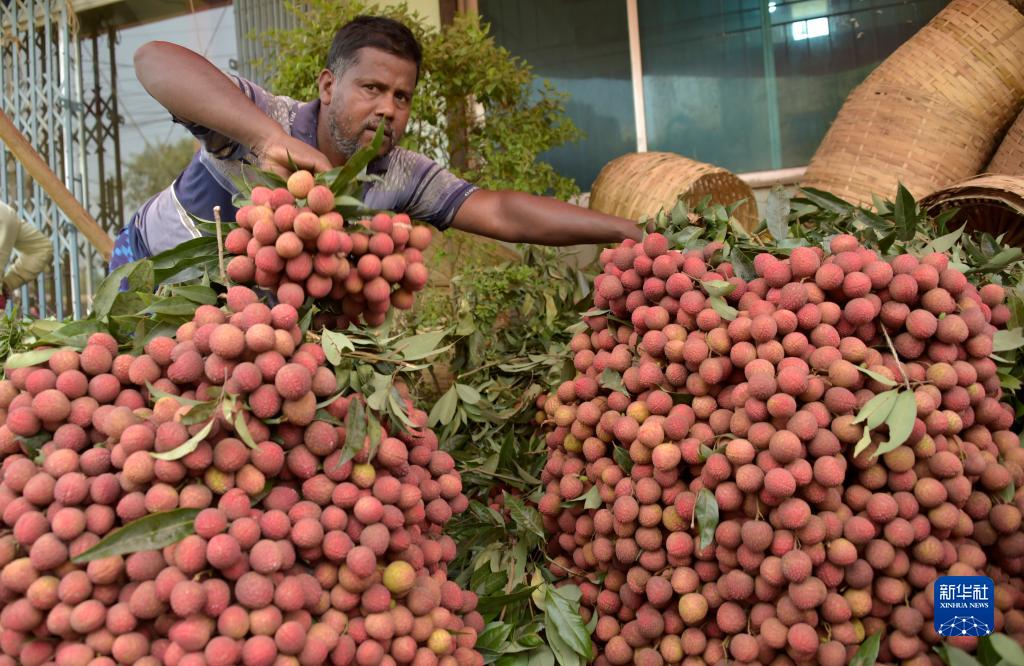 這是6月4日在孟加拉國迪納杰布爾市場(chǎng)中拍攝的待售的荔枝。