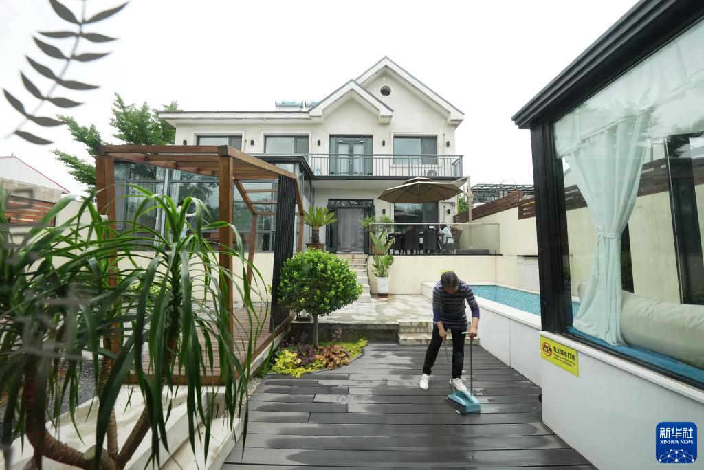 6月5日,秦皇島市北戴河區費石莊村一家精品民宿的工作人員在打掃庭院。