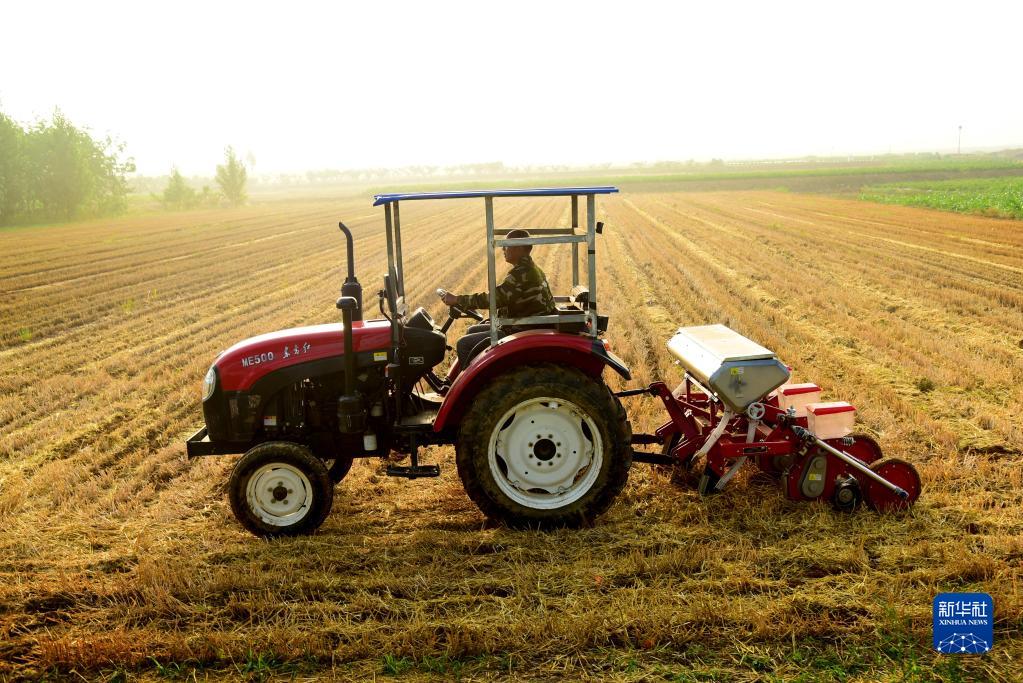 6月6日,農機手駕駛播種機在山東省棗莊市山亭區城頭鎮徐洼村田間播種玉米。