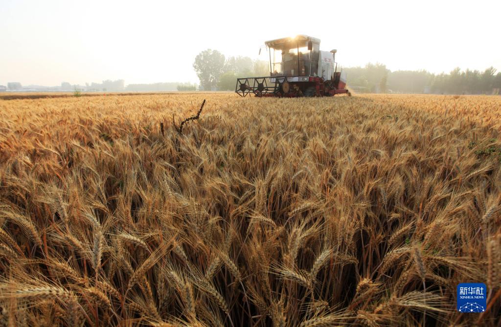 6月6日,在山東省臨沂市平邑縣地方鎮大廣良村,農機手駕駛收割機在收割小麥。