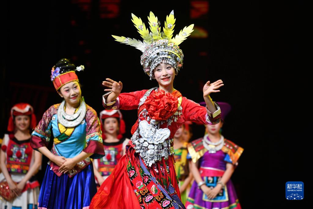 6月5日,演員在貴陽(yáng)大劇院的《多彩貴州風(fēng)》演出中表演節目《多情貴州》。