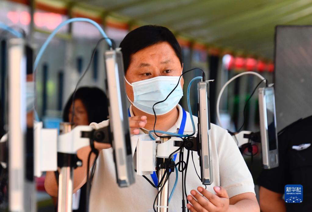 6月6日,北京育英中學(xué)工作人員在檢查高考入校識別設備。