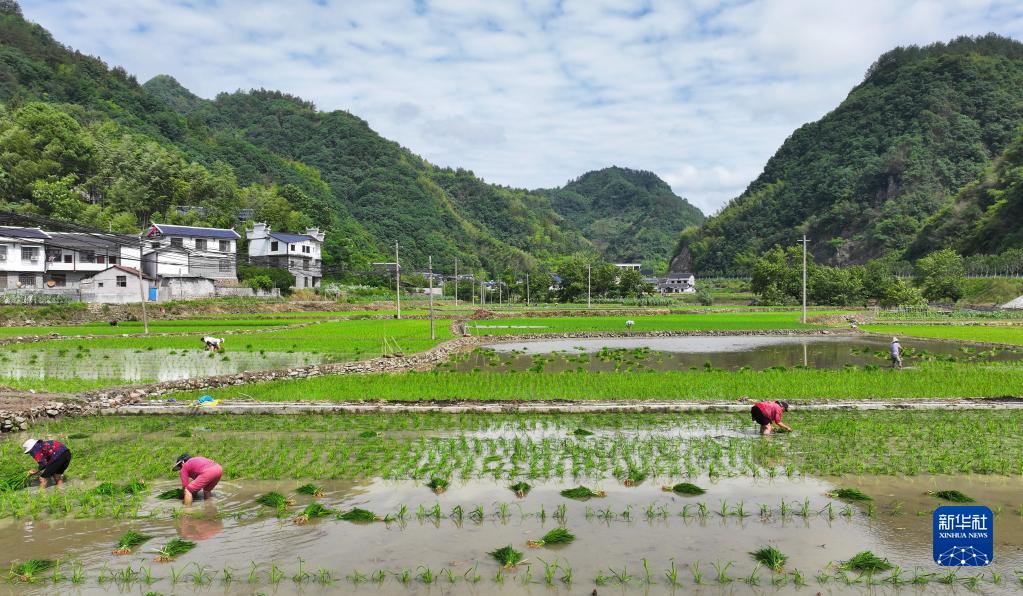 6月6日,湖南張家界市武陵源區協(xié)合鄉李崗村的農民在田間插秧。
