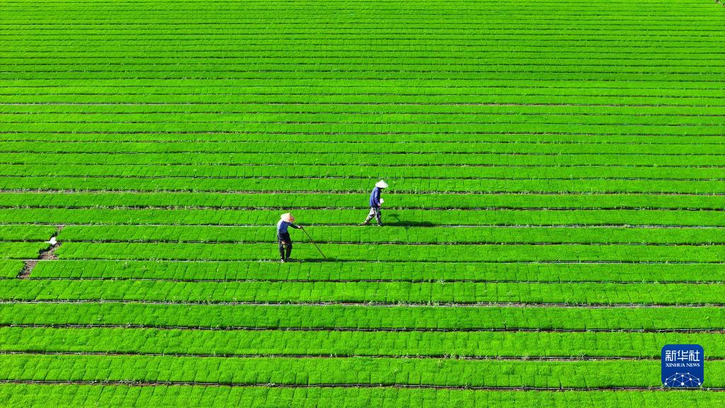 6月6日,江蘇省淮安市洪澤區岔河鎮東陳村農民在育秧基地管護秧苗(無(wú)人機照片)。