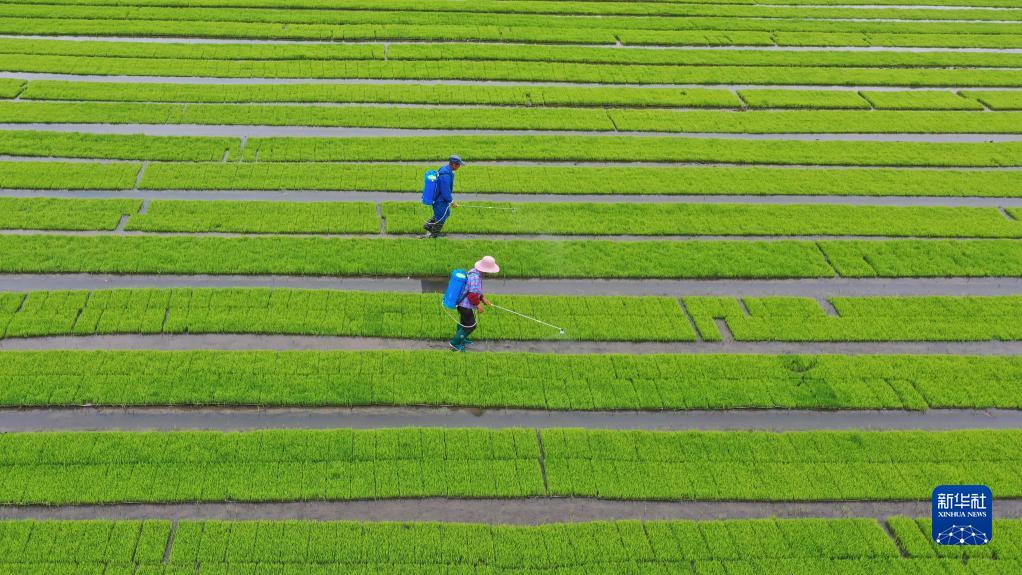 6月6日,農民在江蘇省泰州市海陵區罡楊鎮西馮村為秧苗殺蟲(chóng)(無(wú)人機照片)。