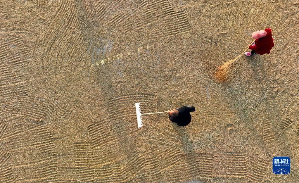 6月6日,陜西省渭南市合陽(yáng)縣洽川鎮南義社區農民在晾曬小麥(無(wú)人機照片)。