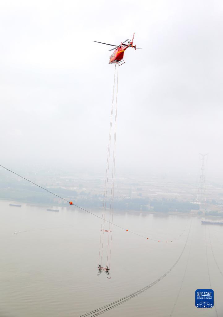 6月6日,在安徽蕪湖的長(cháng)江邊,直升機將檢修人員吊送至±800千伏建蘇線(xiàn)上進(jìn)行帶電作業(yè)。