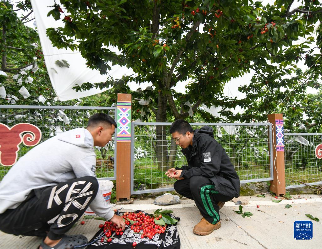 在四川省阿壩州汶川縣蘿卜寨村,王光強(右)和村民商量櫻桃收購價(jià)格(6月2日攝)。