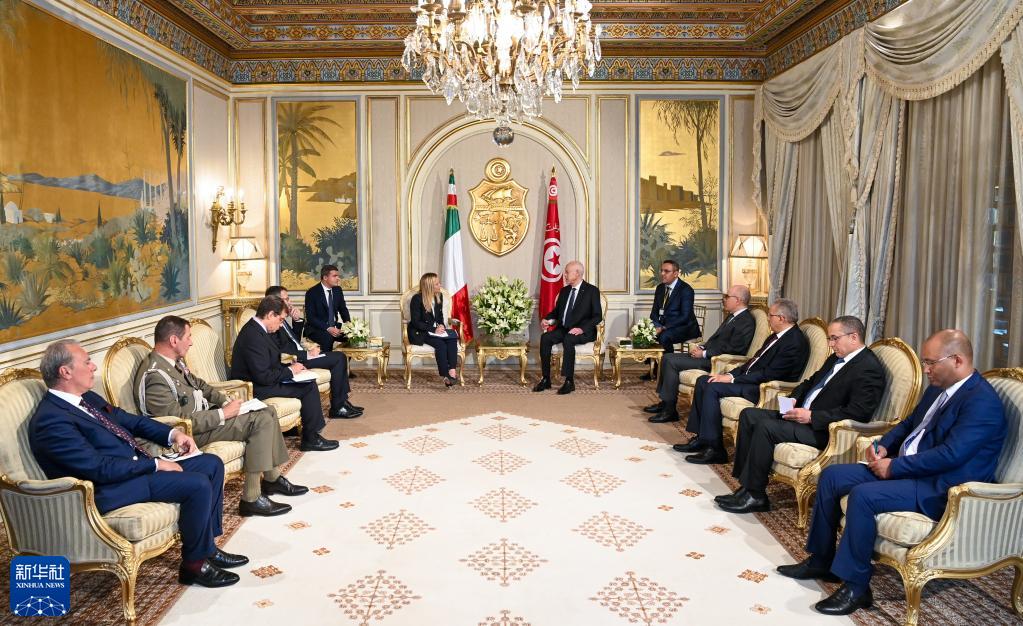 6月6日,突尼斯總統賽義德(中右)在總統府會(huì )見(jiàn)意大利總理梅洛尼(中左)。