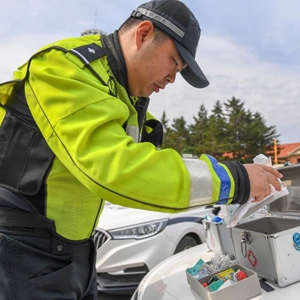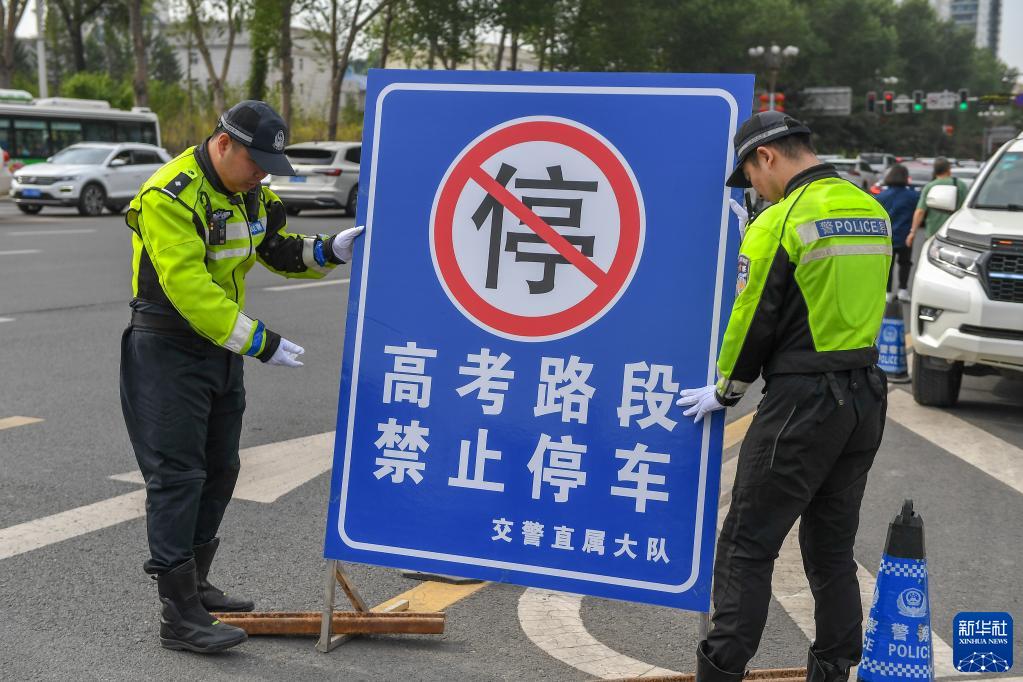 6月7日,在位于吉林省長(cháng)春市的吉林省實(shí)驗中學(xué)考點(diǎn)外,交警設置交通管理提示牌。