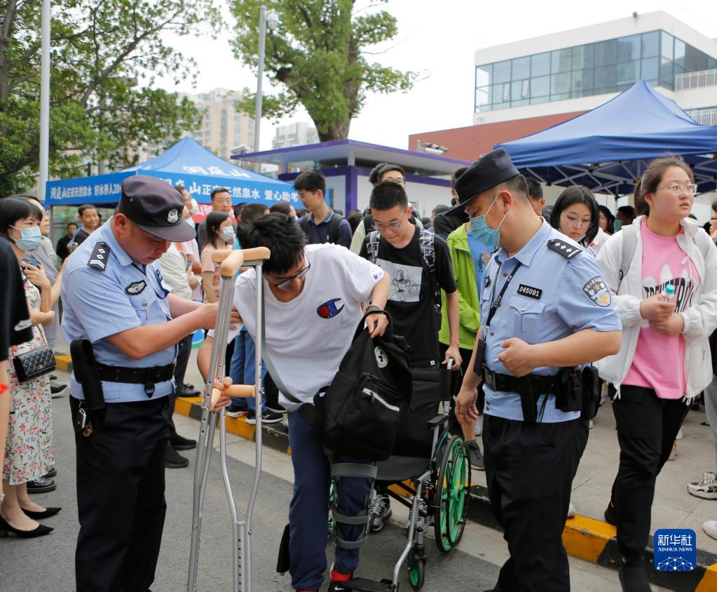 6月7日,在蘇州工業(yè)園區星海實(shí)驗中學(xué)考點(diǎn)外,警察幫助一名行動(dòng)不便的考生離開(kāi)考場(chǎng)。