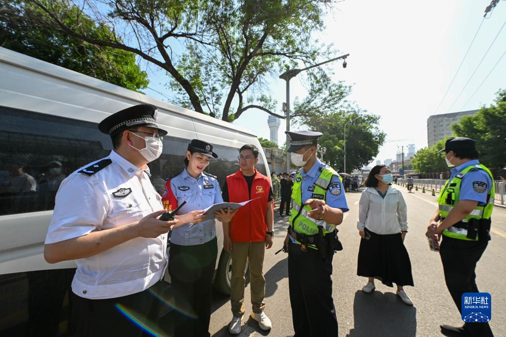 6月7日,在天津市第四中學(xué)考點(diǎn),公安民警與志愿者在考場(chǎng)外執勤,隨時(shí)為考生提供服務(wù)。