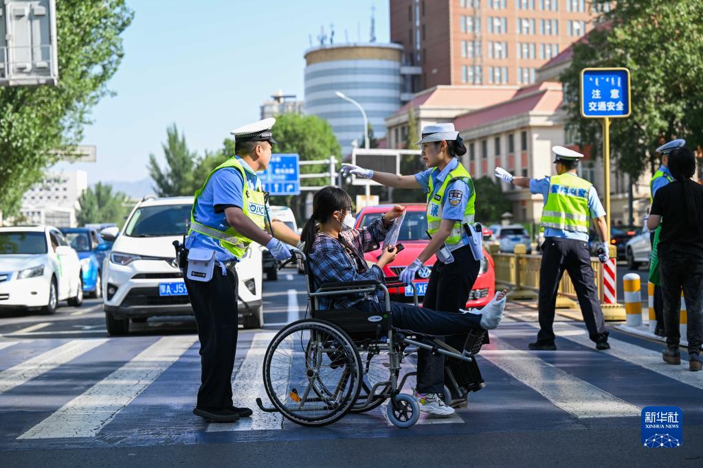 6月7日,在呼和浩特市第二中學(xué)考點(diǎn)外,交警在幫助一名受傷考生進(jìn)入考場(chǎng)。