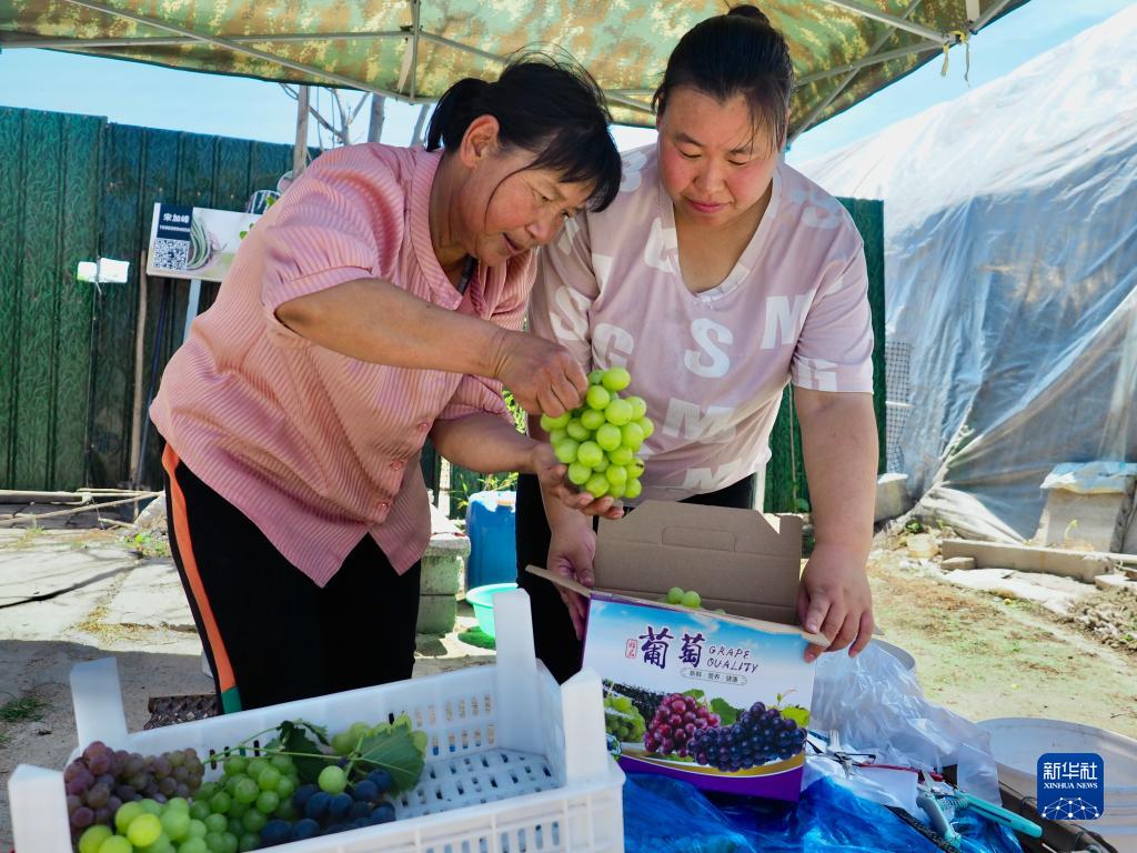 6月6日,在楊柳雪鎮西辛莊村的果蔬大棚外,種植戶(hù)在分裝游客采摘的葡萄。