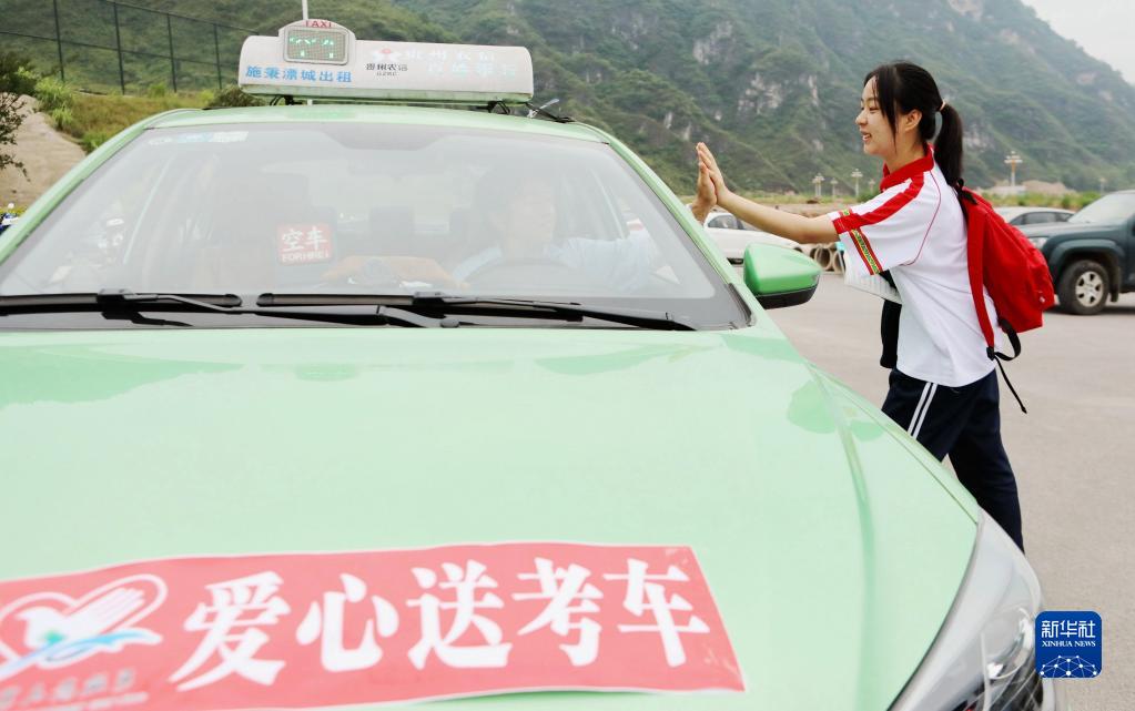 6月7日,愛(ài)心送考司機在貴州省黔東南苗族侗族自治州施秉縣第一中學(xué)考點(diǎn)與考生擊掌加油。
