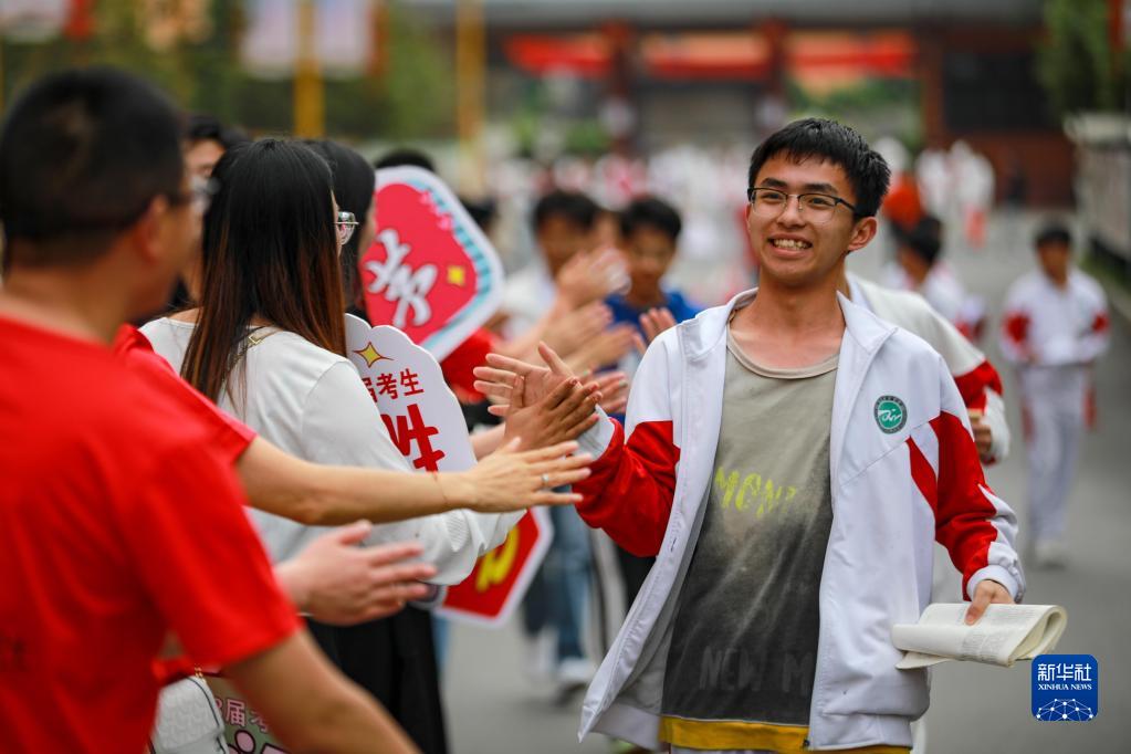 6月7日,考生在貴州省畢節市民族中學(xué)考點(diǎn)和送考老師擊掌。