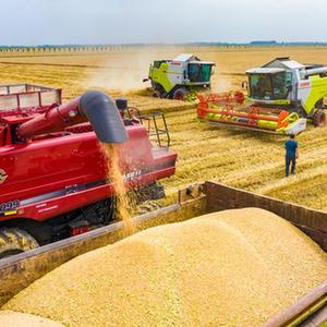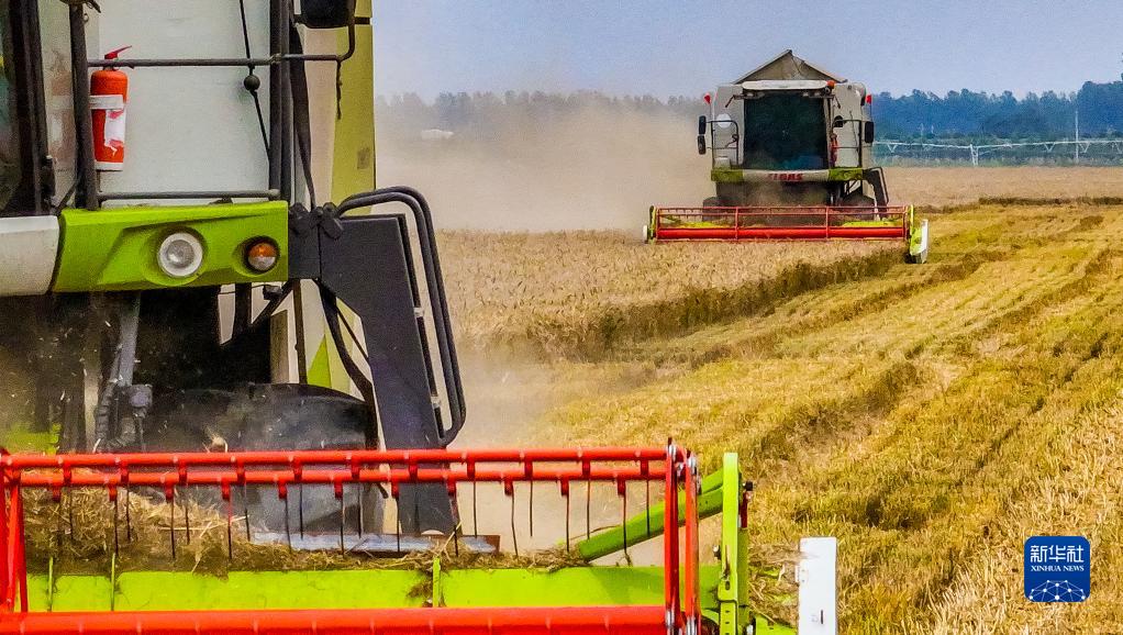 “三夏”時(shí)節,在河南省駐馬店市西平縣老王坡高標準農田,農機手操作大型收割機收割小麥,田間地頭一派忙碌景象。