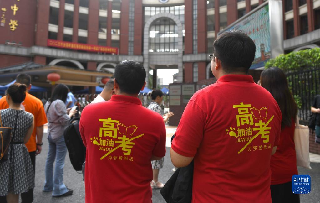 6月7日,在廣東華僑中學(xué)考點(diǎn),送考老師為學(xué)生加油打氣。