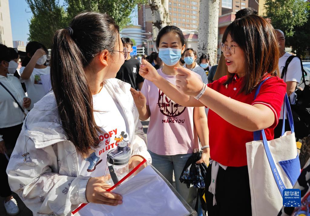 6月7日,在內蒙古自治區呼和浩特市第二中學(xué)考點(diǎn)外,老師(右)為即將走入考場(chǎng)的學(xué)生加油鼓勁。