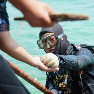 海南省三亞蜈支洲島海域海洋牧場(chǎng)是海南首個(gè)國家級海洋牧場(chǎng)示范區,蜈支洲島旅游區海洋部經(jīng)理王豐國作為海洋牧場(chǎng)建設的一線(xiàn)作業(yè)人員,致力于海域生態(tài)環(huán)境的修復和保護。他與海為伴,完成人工魚(yú)礁、船礁投放,珊瑚移植,協(xié)助科研機構調研等工作?!拔覀円彩撬虑宓婪颉?,清理海洋垃圾和珊瑚敵害,也是王豐國的日常工作。