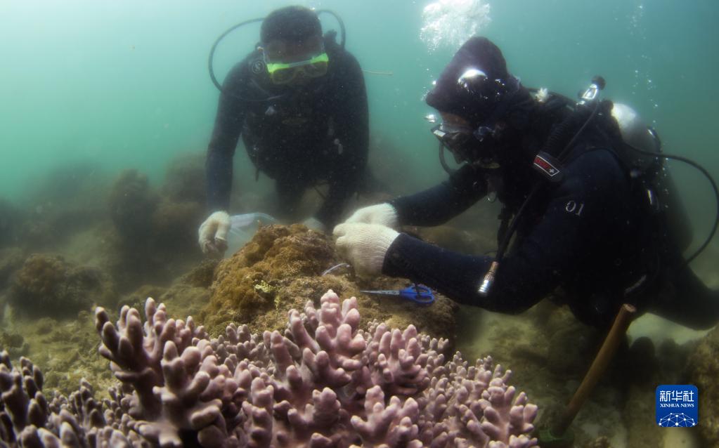 在蜈支洲島海域海洋牧場(chǎng),王豐國(右)在移植珊瑚(5月17日攝)。