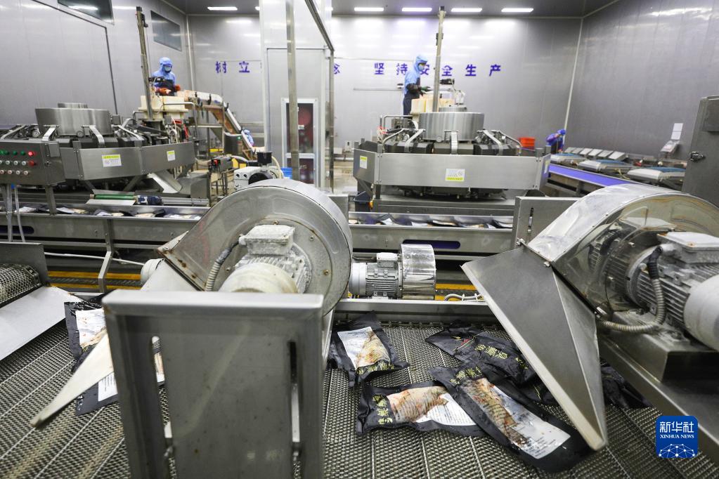 這是6月7日在安徽省黃山市一家食品供應鏈公司內拍攝的臭鱖魚(yú)加工制作生產(chǎn)線(xiàn)。