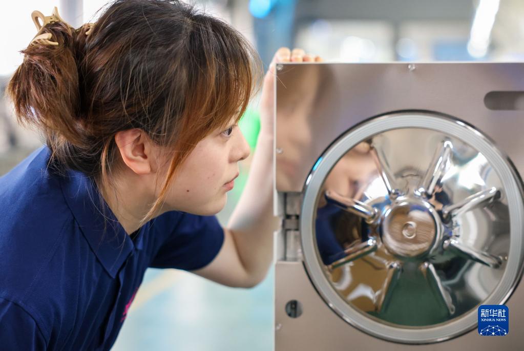 6月7日,徐依在生產(chǎn)車(chē)間內檢查成品質(zhì)量。