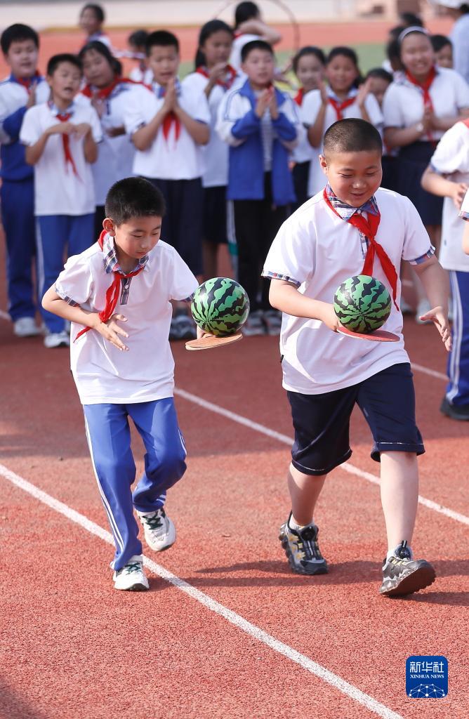 6月7日,山東省青島市即墨區鰲山衛方正小學(xué)的學(xué)生在進(jìn)行“托西瓜”比賽。