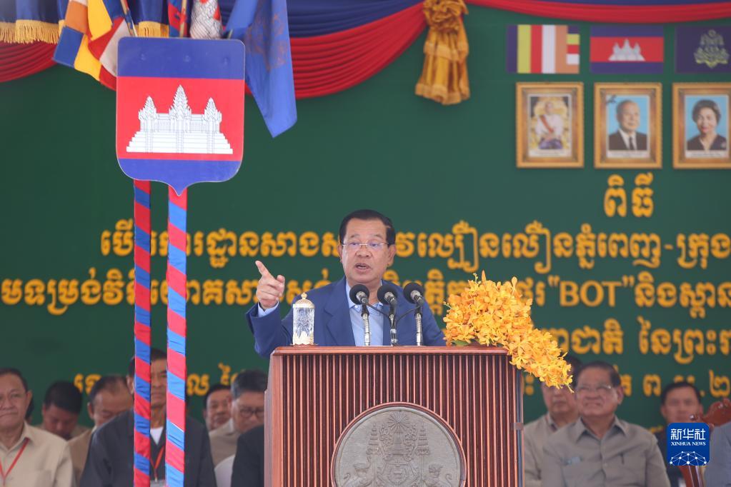 6月7日,柬埔寨首相洪森在柬埔寨干丹省出席高速公路開(kāi)工典禮時(shí)講話(huà)。