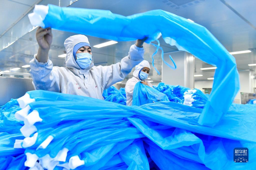 6月7日,在山東康力醫療器械科技有限公司,工作人員整理疊放防護服。