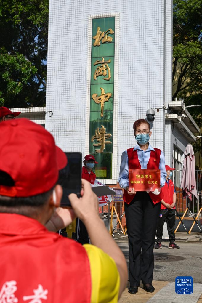6月7日,高考第一天,段鳳麗將考生送到考場(chǎng)松崗中學(xué)后,在學(xué)校門(mén)口留影。