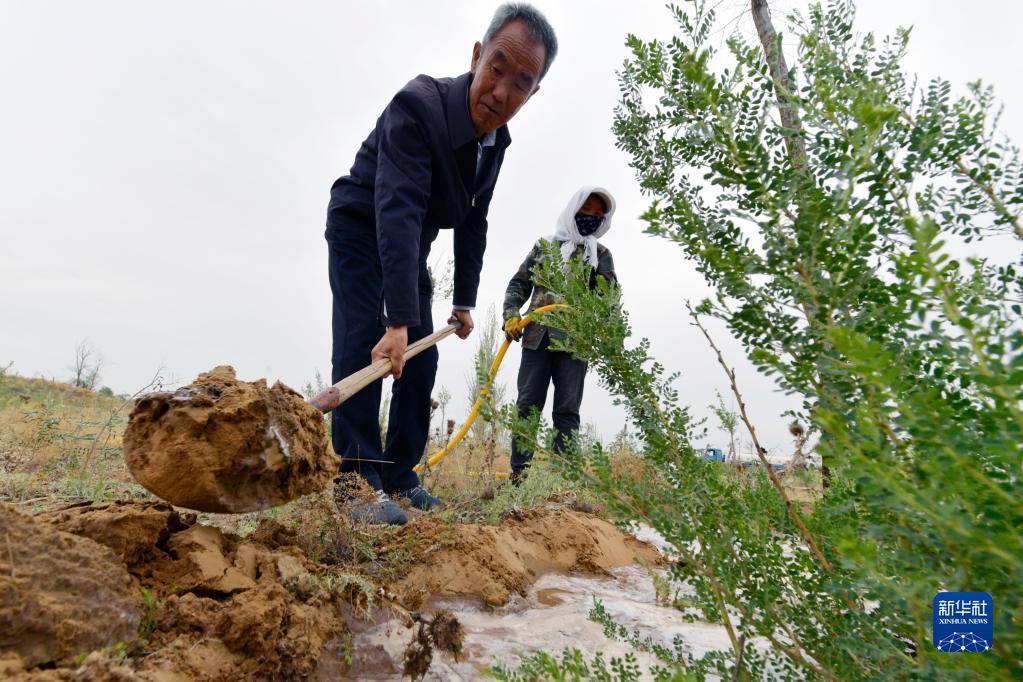6月2日,八步沙林場(chǎng)場(chǎng)長(cháng)郭萬(wàn)剛在位于武威市古浪縣的一片林區管護樹(shù)苗。