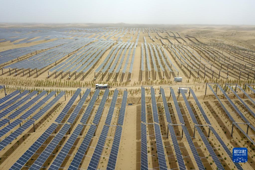 這是6月1日拍攝的武威市涼州區九墩灘光伏治沙示范園區(無(wú)人機照片)。