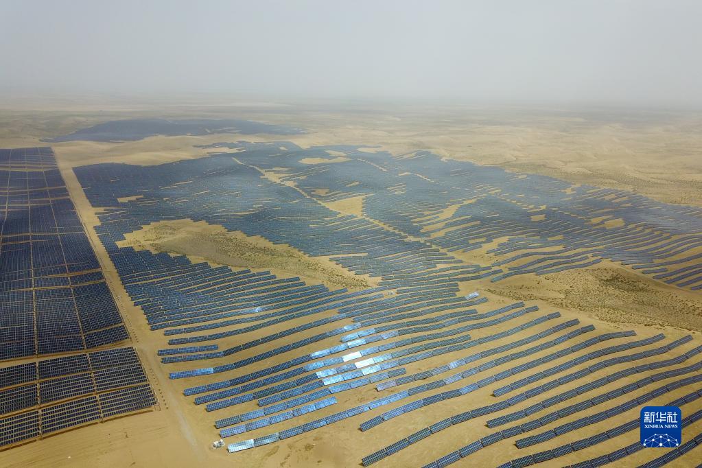 這是6月1日拍攝的武威市涼州區九墩灘光伏治沙示范園區(無(wú)人機照片)。