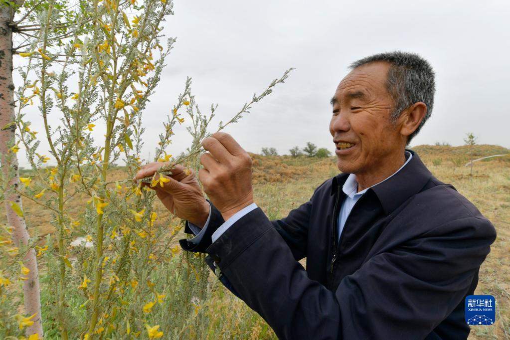 6月2日,在位于武威市古浪縣的一片林區,八步沙林場(chǎng)場(chǎng)長(cháng)郭萬(wàn)剛查看樹(shù)苗生長(cháng)情況。