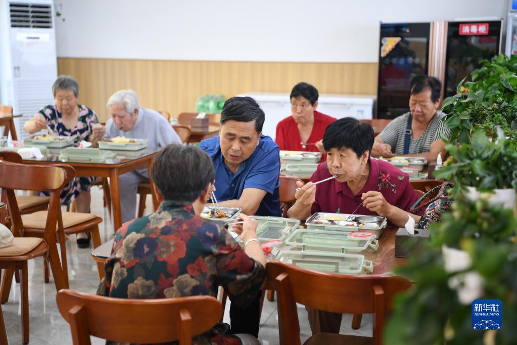 6月8日,老人們在河北省灤州市灤城街道龍山帝景社區一家社區養老中心內吃飯。