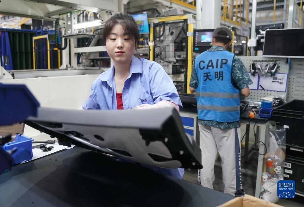 6月7日,在江蘇常熟汽飾集團生產(chǎn)車(chē)間,工人在生產(chǎn)汽車(chē)門(mén)內護板。