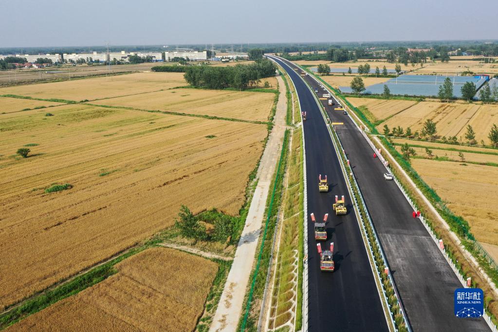 工人在連宿高速公路沭陽(yáng)至宿豫段施工(6月6日攝,無(wú)人機照片)。