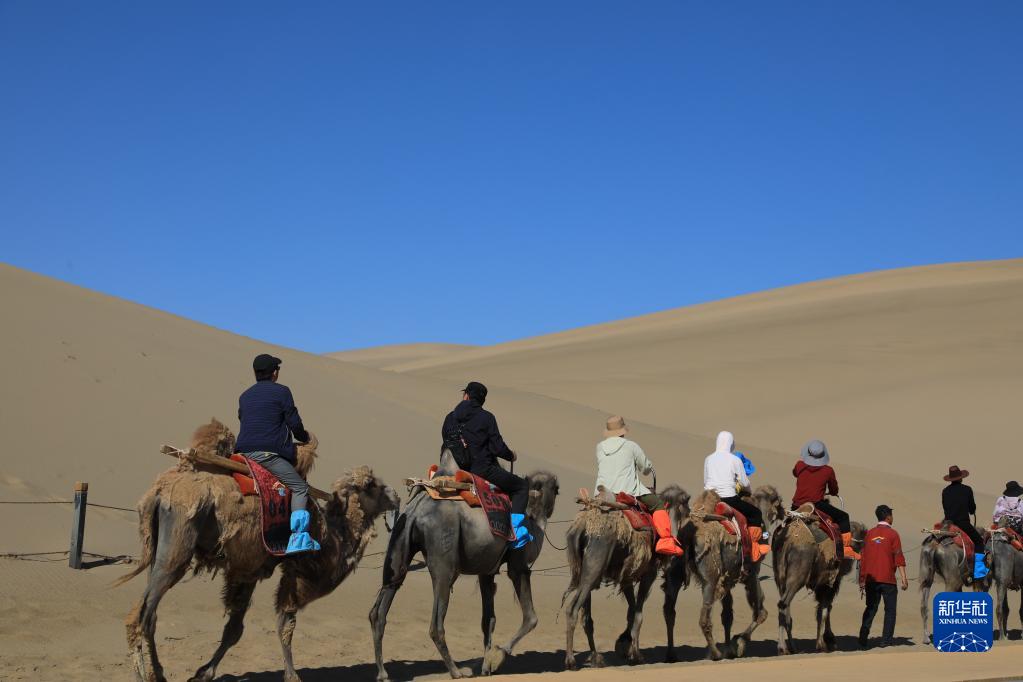 6月7日,在甘肅敦煌鳴沙山月牙泉景區,游客騎乘駱駝感受大漠風(fēng)光。