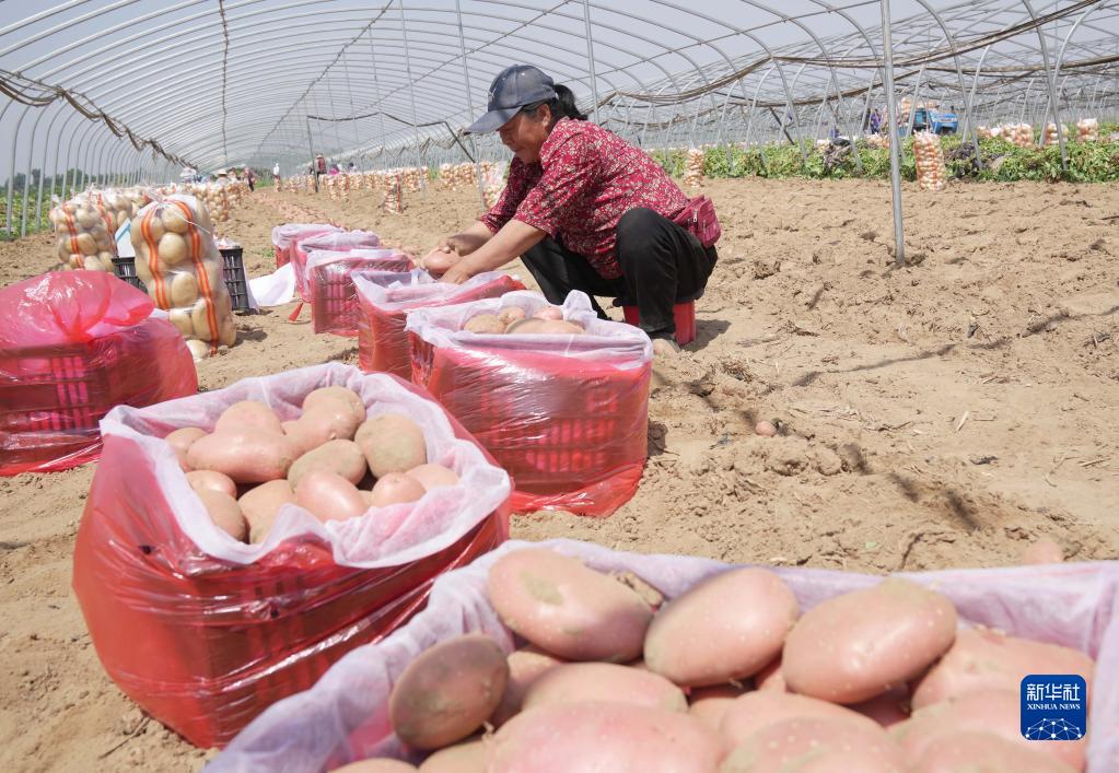 6月8日,昌黎縣新集鎮西新莊村農民在田間將收獲的馬鈴薯裝箱。