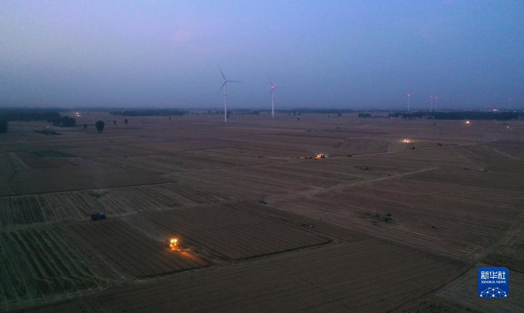 6月7日晚,收割機在袁營(yíng)村搶收(無(wú)人機照片)。
