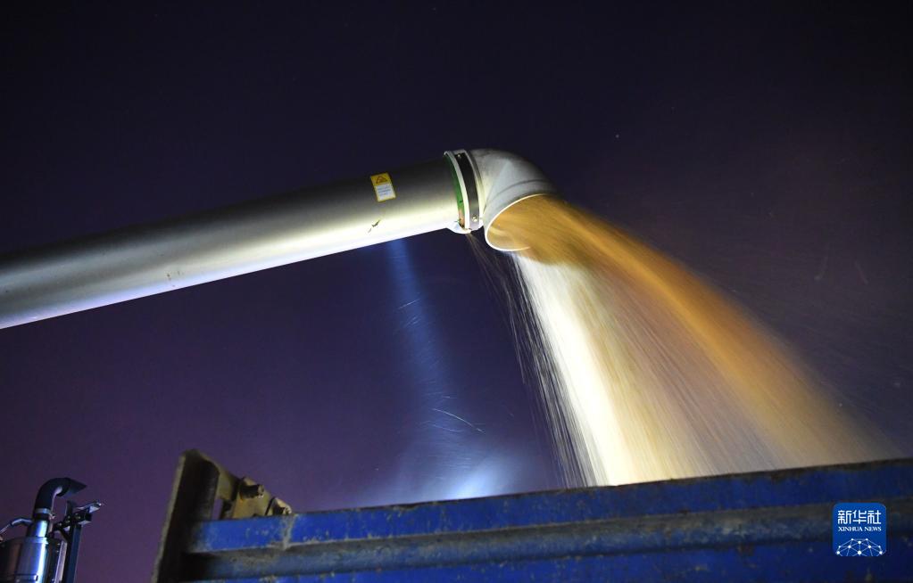 6月7日晚,收割機將收獲的小麥裝車(chē)。
