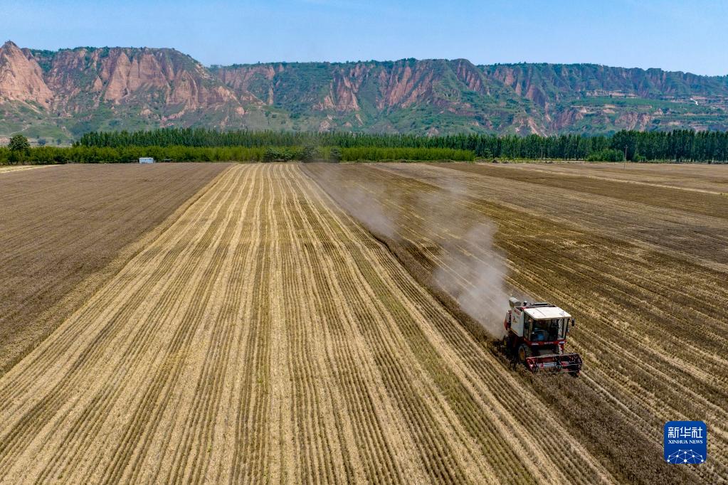 6月8日,在河南省三門(mén)峽市城鄉一體化示范區大王鎮后地村,聯(lián)合收割機在搶收小麥(無(wú)人機照片)。